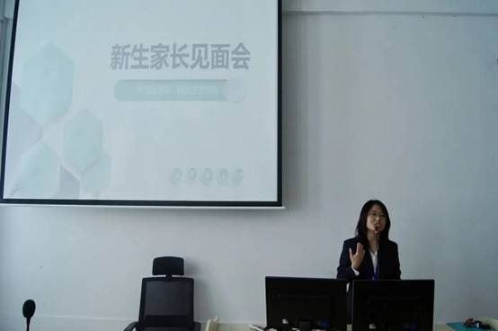 随后,副院长王丹从学院概况、专业介绍、师资展示、成果展示、发展方向五个方面向新生及家长介绍了学院整体情况,同时就学院教育教学等工作情况做了详实解释。
