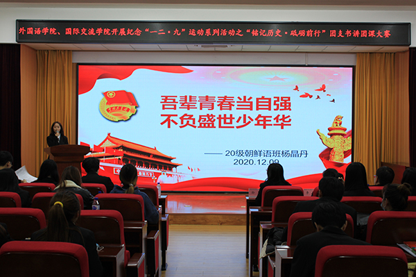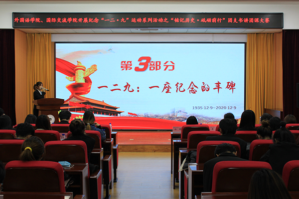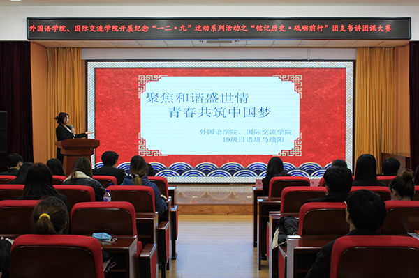 为纪念“一二·九”运动,发挥各班团支书榜样引领作用,培养优秀青年爱国主义者,引导广大学生成为社会主义核心价值观的坚定信仰者、广泛传播者、模范践行者,12月9日中午,外国语学院、国际交流学院在筑梦报告厅开展“铭记历史·砥砺前行”团支书讲团课的讲演比赛。学院党总支书记孙野、团委书记戴军威、辅导员李姗、礼晓宇、高诗聪,学院团学组织学生干部共同观看了比赛。