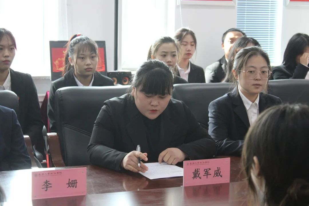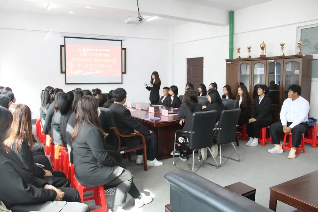 高举旗帜跟党走,奉献青春创佳绩,在深化推进学生会改革的背景下,10月4日中午11点40分,外国语学院、国际交流学院第二次学生代表大会于综合实训楼201会议室隆重召开。学院团委书记戴军威,辅导员李姗、柳睿、姚百宁、殷悦及各年级正式代表共32人参加了本次会议。会议由外国语学院、国际交流学院团委思想引领项目中心主任王锐主持。