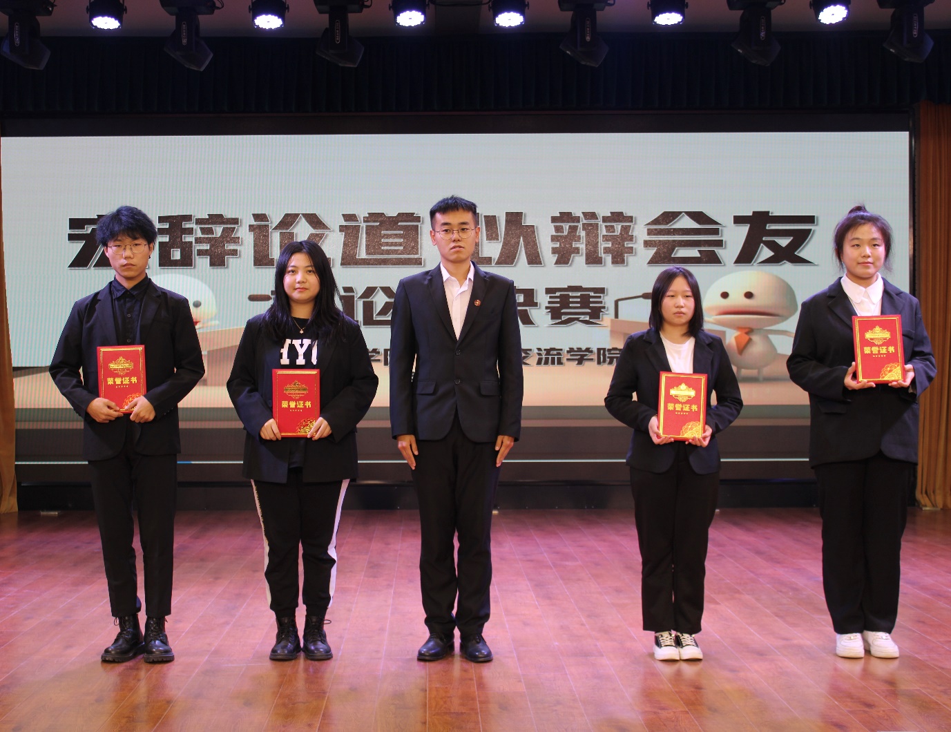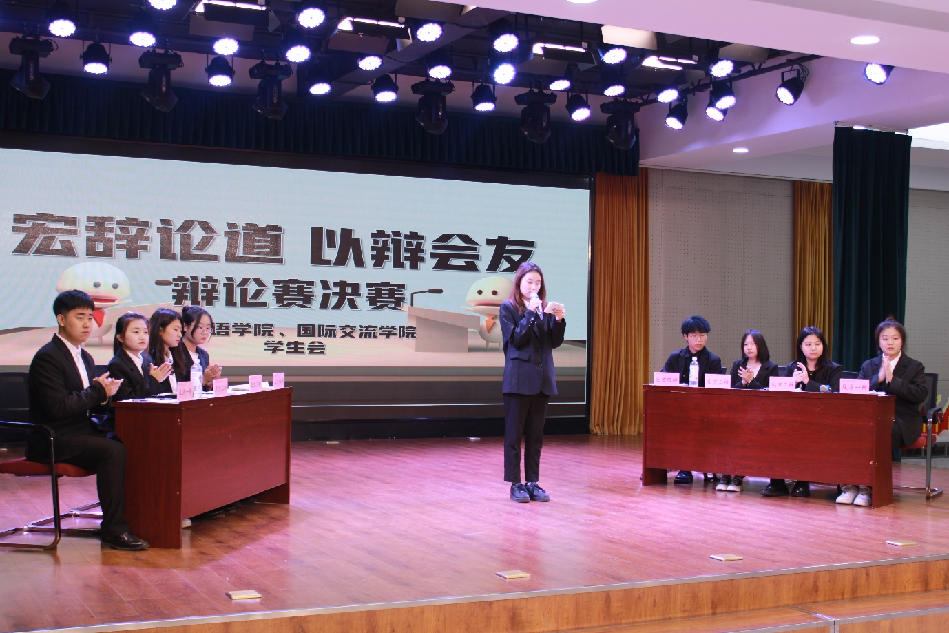 积极落实学校“厚德修身”学生素质养成工程方案精神,丰富学生课余生活,提高学生的语言表达能力和逻辑思维能力,外国语学院、国际交流学院于10月29日在大学生活动中心举办“宏辞论道,以辩会友”主题辩论赛决赛。本次比赛有幸邀请到学校辩论队队长王文博,院团委学生副书记刘禹彤,秘书长罗兰、周柳均,学生会轮值主席冷雨橦、申辰婧,秘书长赵书妍以及杨晶丹等4位20级最佳辩手担任评委。