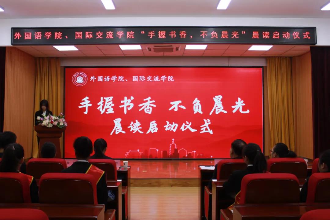 为深入贯彻党的教育方针,落实立德树人根本任务,培养广大学生持之以恒的学习精神和科学合理的生活习惯,夯实语言基本功,营造学院良好学习氛围。外国语学院、国际交流学院结合《金沙js9线路中心“厚德修身”学生素质养成工程实施方案》工作精神,组织开展“手握书香,不负晨光”晨读活动,活动启动仪式于10月26日清晨在学校筑梦报告厅举行。学校党委副书记、副校长马维东莅临现场,学院党总支书记孙野,团委书记戴军威,辅导员李姗、殷悦、姚柏宁、柳睿以及全体学生党员、学生代表参加仪式。仪式由学生会轮值主席冷雨橦主持。