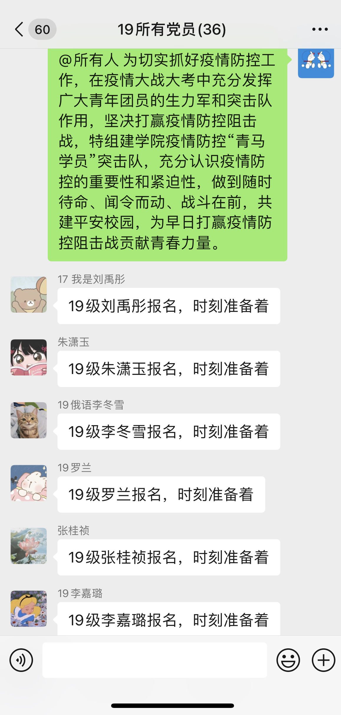 在吉林省抗击新冠肺炎疫情的特殊时期,为贯彻落实新冠疫情防控工作要求,筑牢校园安全防线,发扬“党有号召,团有行动”优良传统,外国语学院、国际交流学院闻令而动,迅速部署,组建了一支由学生党员、学生干部骨干为主要成员的青马学员突击队。
