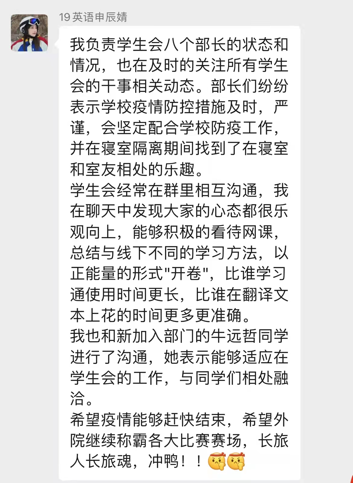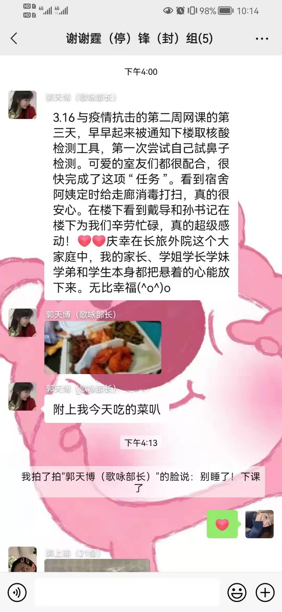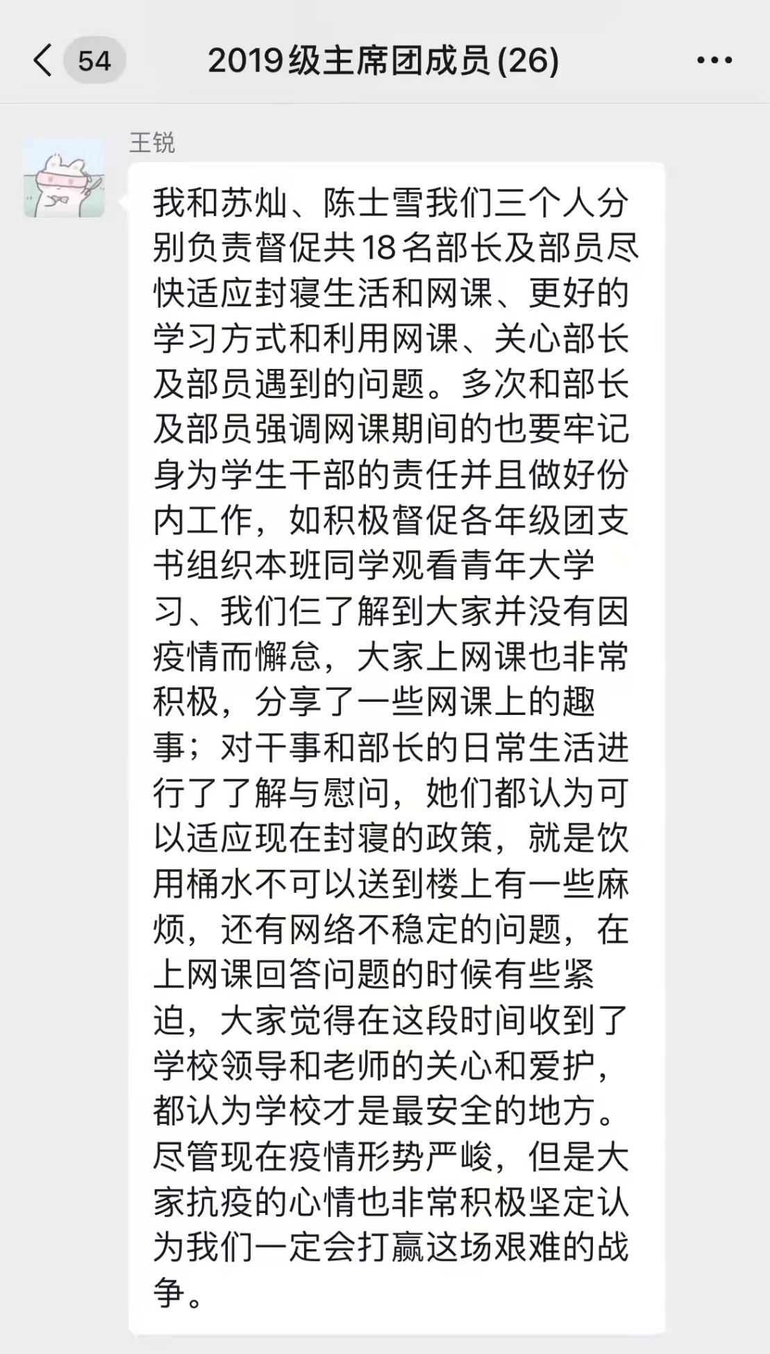在校生党员和学生干部发挥先锋模范作用,通过细化学生党团组织网格化设置,精心打造了以学院党团学组织——班集体——寝室为基本框架的组织体系,形成全链条式闭环工作模式,做到工作要求及时传达、工作内容逐步细化、工作任务有效落实,不遗死角、不留盲区,既分工负责,又相互支持、形成工作合力。精细的网格化管理推进,给每位学生带来满满的安全感和抗疫必胜的信心。