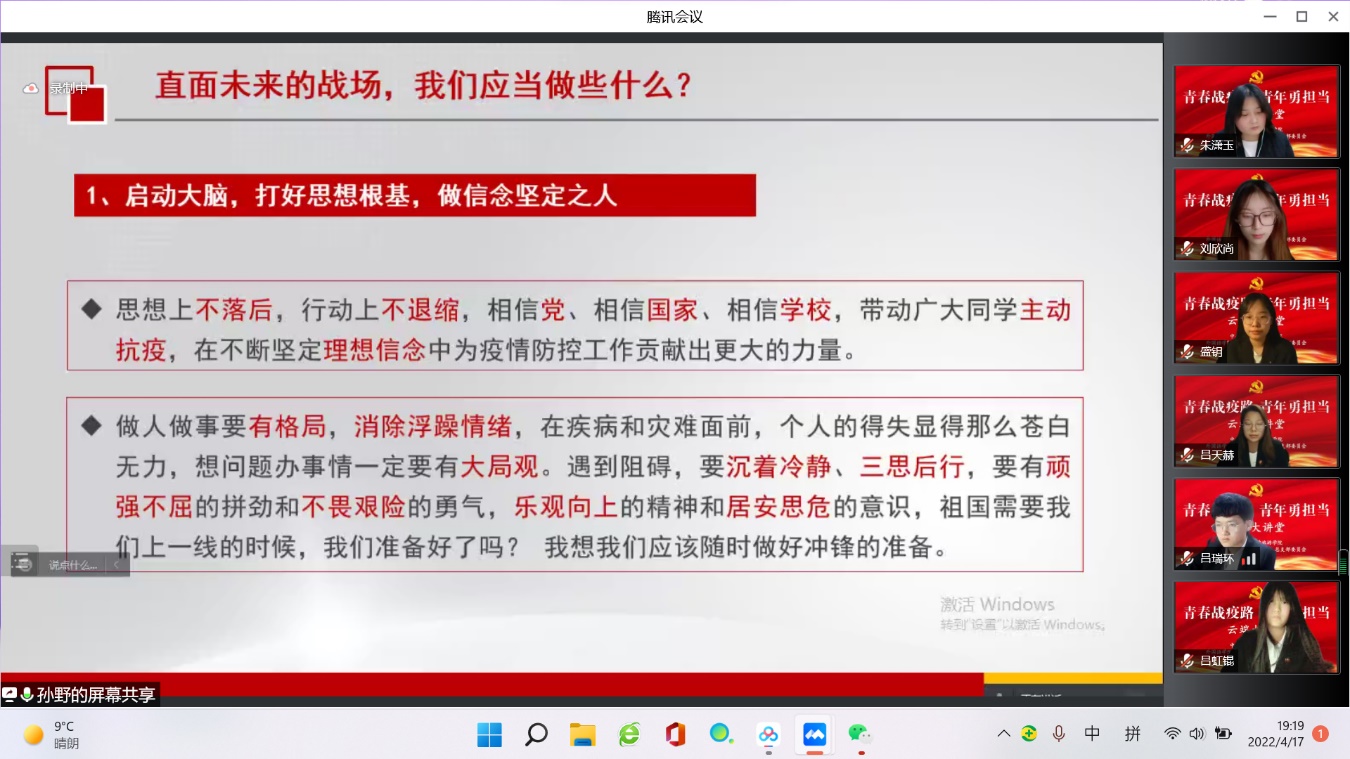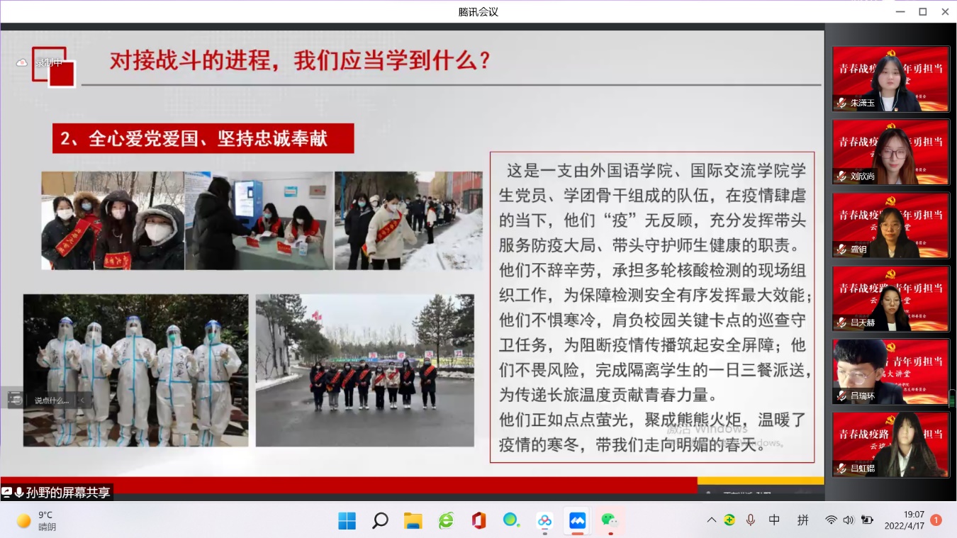为深入学习贯彻习近平总书记重要指示批示精神,全面贯彻省疫情防控工作领导小组部署要求,积极响应学校党委号召,提升学院党组织组织力、战斗力,引导广大师生从抗疫的生动实践中坚定信念,汲取力量,同频共振,4月17日晚,外国语学院、国际交流学院开展“青春战疫路、青年勇担当”云端大讲堂活动,此次大讲堂由外国语学院(国际交流学院)党总支书记孙野主讲,全体辅导员、学生党员、学团组织学生干部以及班级主要学生干部等240余人参加此次活动。