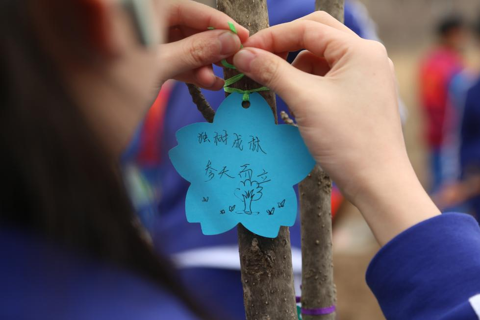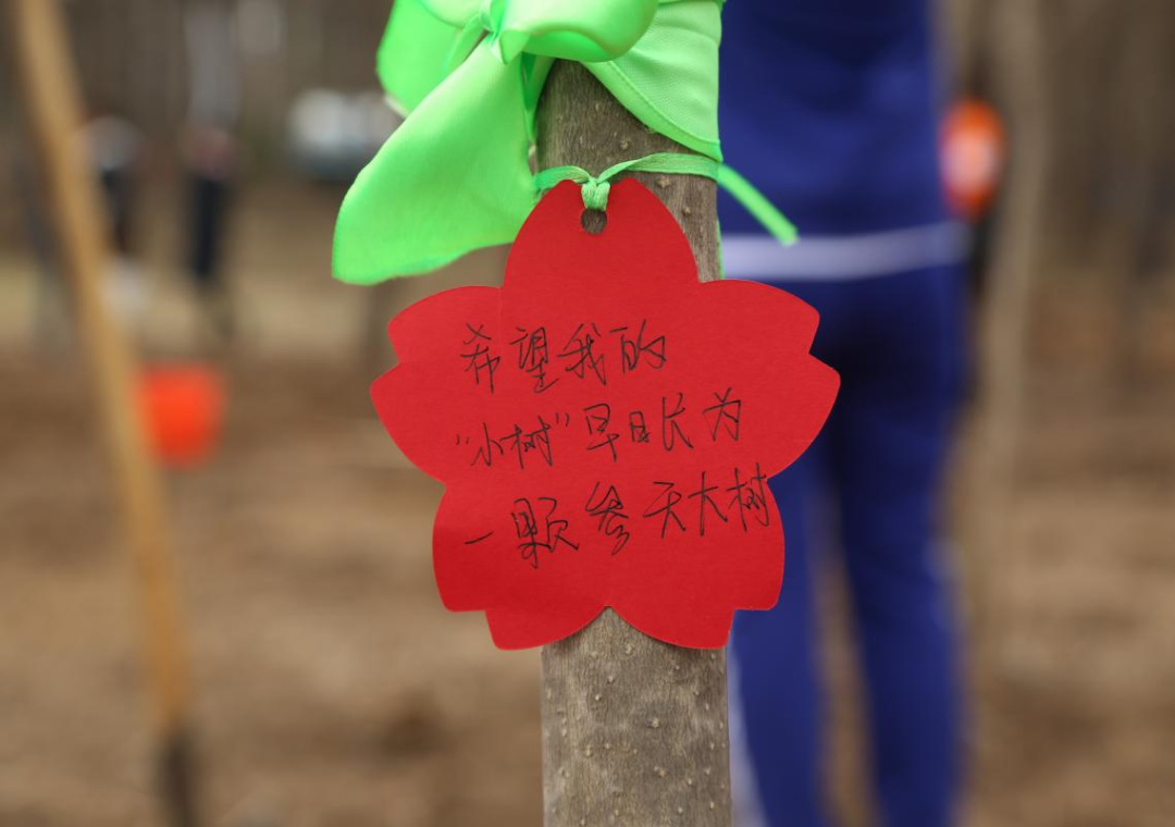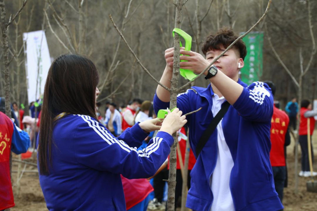 植树现场,蒋森、柳睿带领30名志愿者挥锹铲土、扶苗填坑、踩土定植、提水浇灌,将一颗颗泛着新绿的树苗栽入土中,并为自己种植的树绑上“绿丝带”,写下长旅学子对净月、对小树的美好祝愿。他们纷纷表示将在日后的工作学习中牢记“爱绿、植绿、护绿”的观念,呼吁大家保护环境、低碳生活。