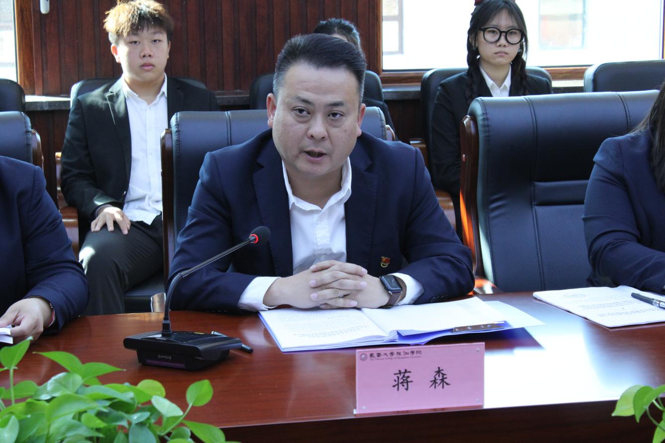 大会伊始,党总支书记蒋森向大会致辞。他首先代表学院党总支向大会的顺利召开表示祝贺,而后高度肯定了学生会过去一年的工作成就,向同学们的辛勤付出表示衷心感谢。同时,他对学生会工作提出三点要求:一是深入学习,引领“有力”;二是注重作风,服务“有型”;三是聚焦主业、工作“有效”。他希望新一届学生会能够团结和带领全院同学,立足学院实际,以实际行动创造新的业绩,以精益求精的工作态度躬身实践,不断推进自身改革,认真履行自身职能,确保学生会建设成为在党的领导下政治过硬、根植同学、风清气正的学生会。最后,蒋森书记预祝本次大会圆满成功。