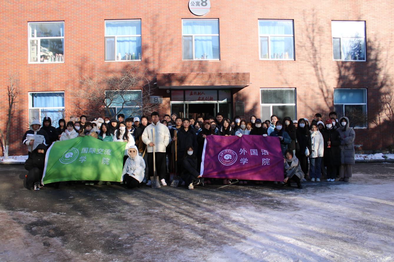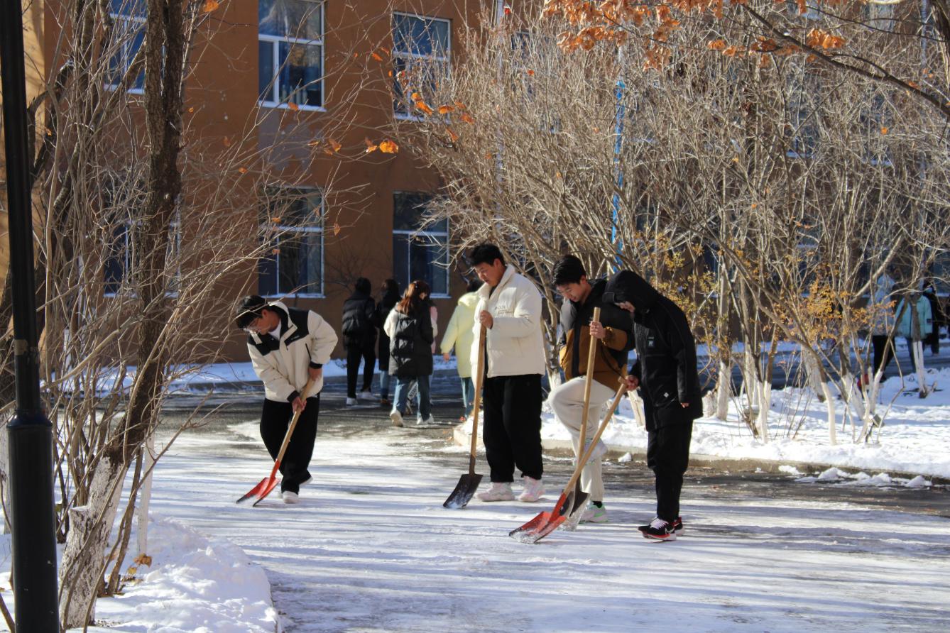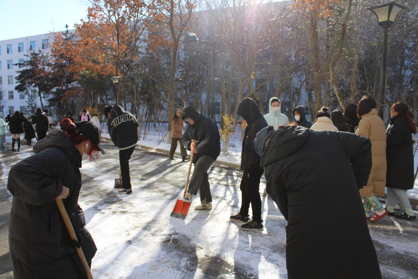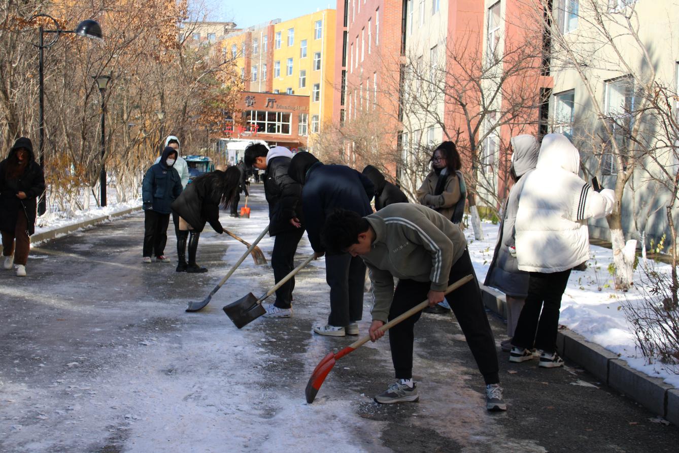 伴随着2023年的第一场大雪,校园内银装素裹,寒冷的冬天已然到来。为确保师生出行安全,加强学生劳动教育,增强学生爱校荣校意识和党员服务奉献意识,11月7日下午,外国语学院、国际交流学院开展“破冰行动”,学生党员和2023级同学们一同清雪除冰,为师生出行开辟安全之路。