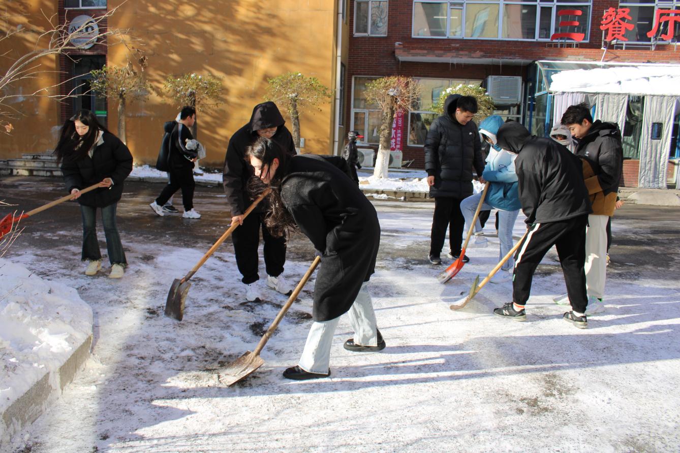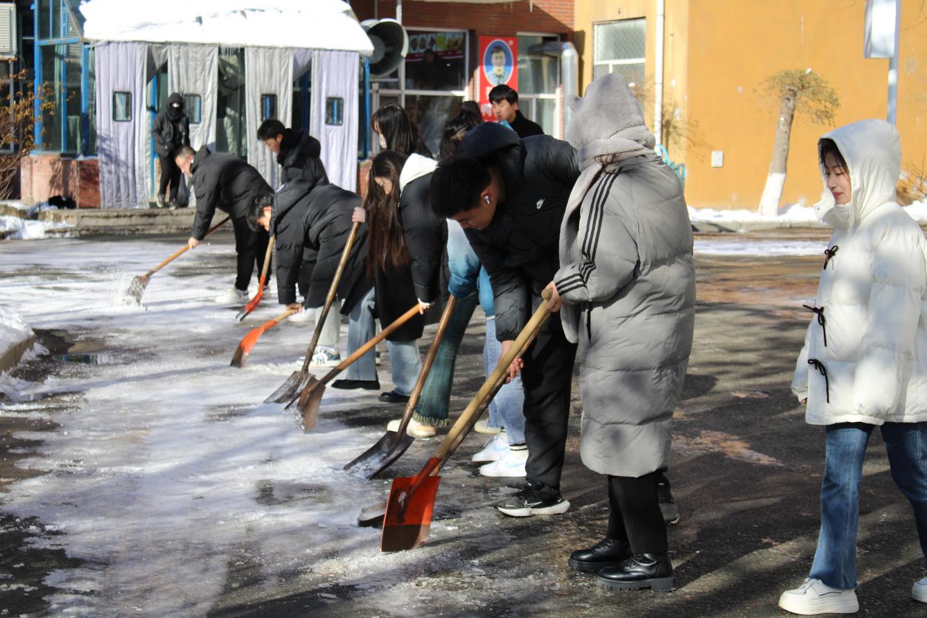 ▲扫雪护行,情暖人心——外国语学院、国际交流学院开展“破冰行动”