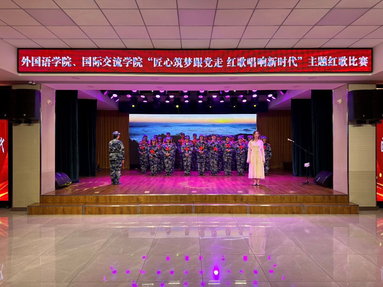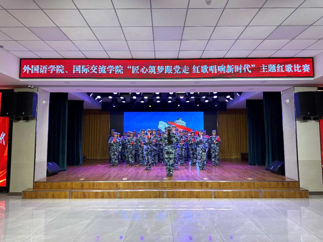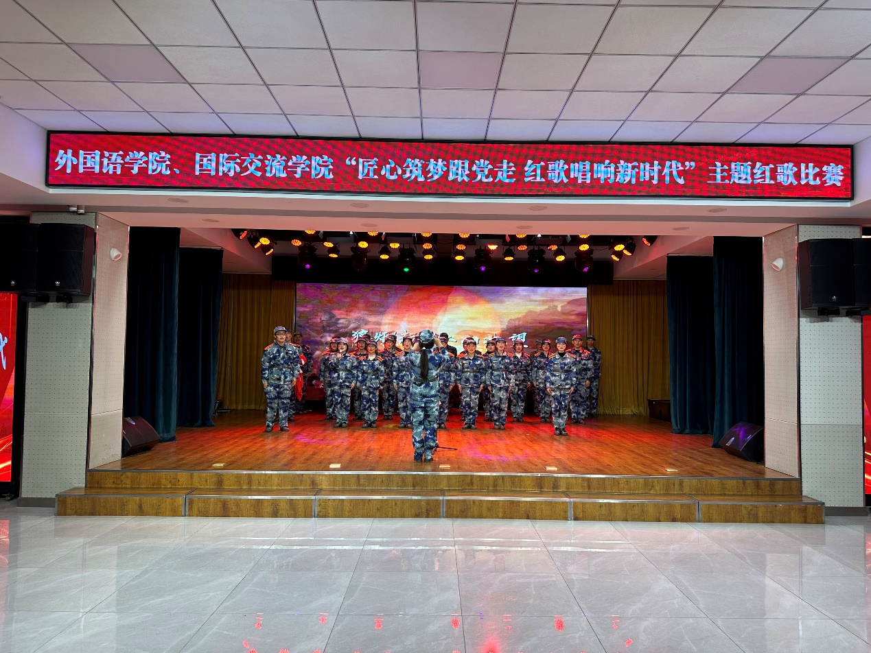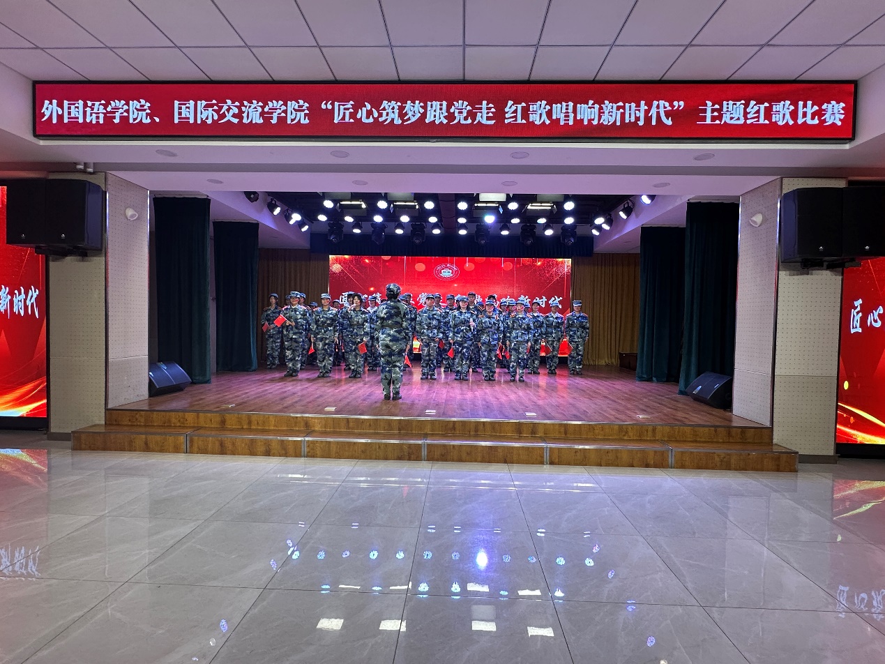 金秋送爽,万里山河披锦绣,大美长旅,高歌欢唱寄深情。为弘扬爱国主义精神,用红色文化启智铸魂,丰富军训文化活动,10月11日,外国语学院、国际交流学院在大学生活动中心举办“匠心筑梦跟党走 红歌唱响新时代”主题红歌比赛。本次比赛由学院党总支书记孙野、辅导员沈鹏飞、刘凯、王瑀晰、徐嘉桧担任评委。