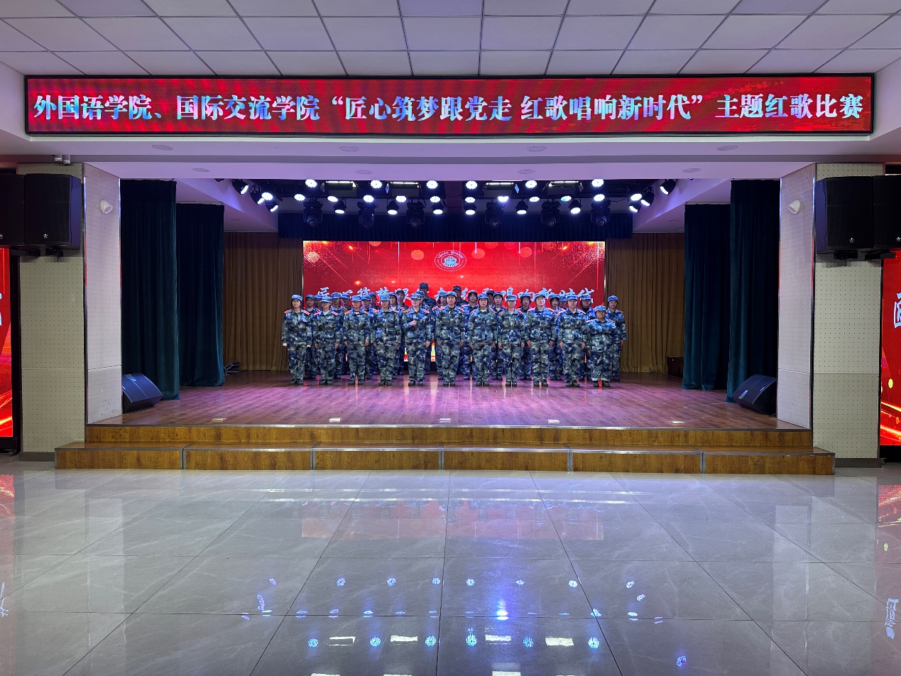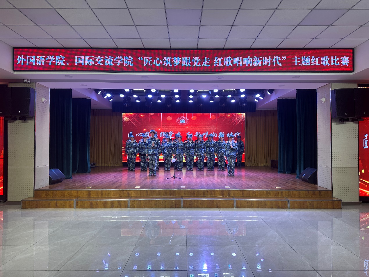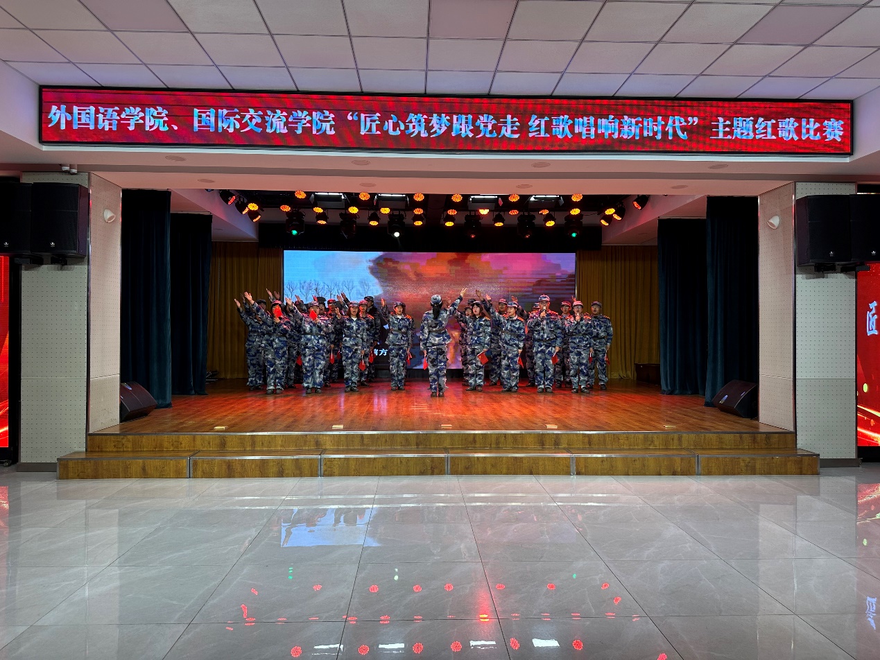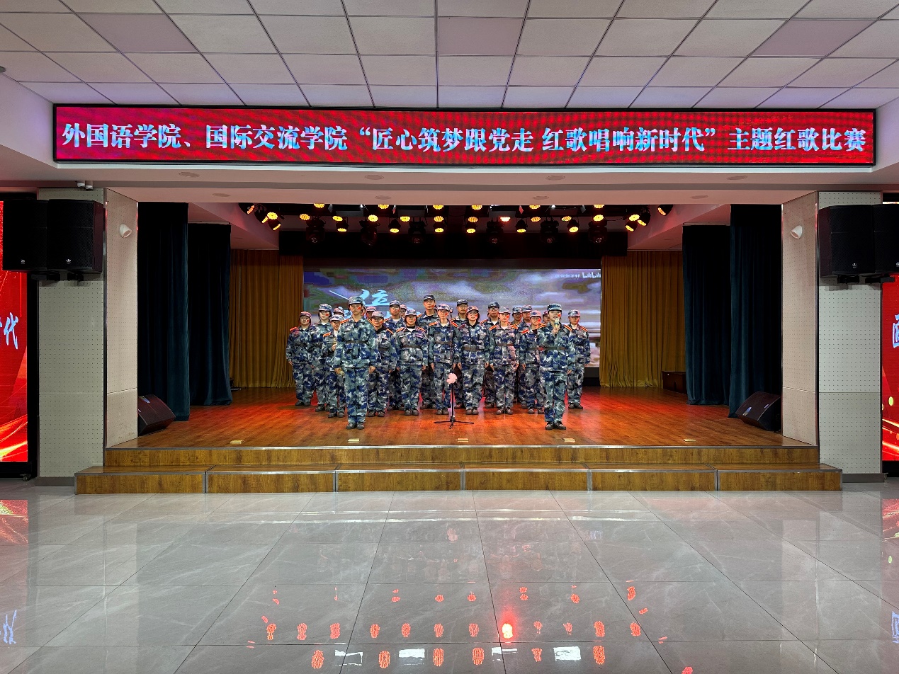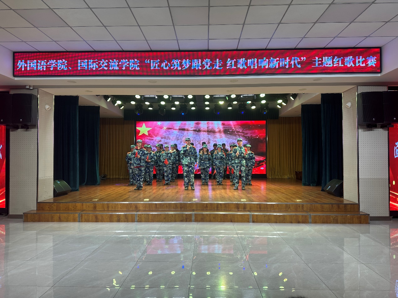 金秋送爽,万里山河披锦绣,大美长旅,高歌欢唱寄深情。为弘扬爱国主义精神,用红色文化启智铸魂,丰富军训文化活动,10月11日,外国语学院、国际交流学院在大学生活动中心举办“匠心筑梦跟党走 红歌唱响新时代”主题红歌比赛。本次比赛由学院党总支书记孙野、辅导员沈鹏飞、刘凯、王瑀晰、徐嘉桧担任评委。