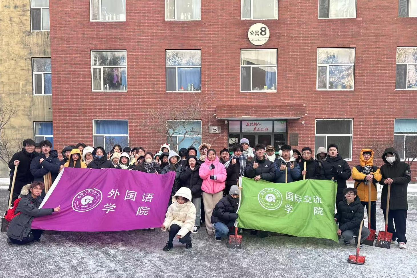 ▲外国语学院、国际交流学院开展“风雪虽寒扫雪情暖”劳动教育活动