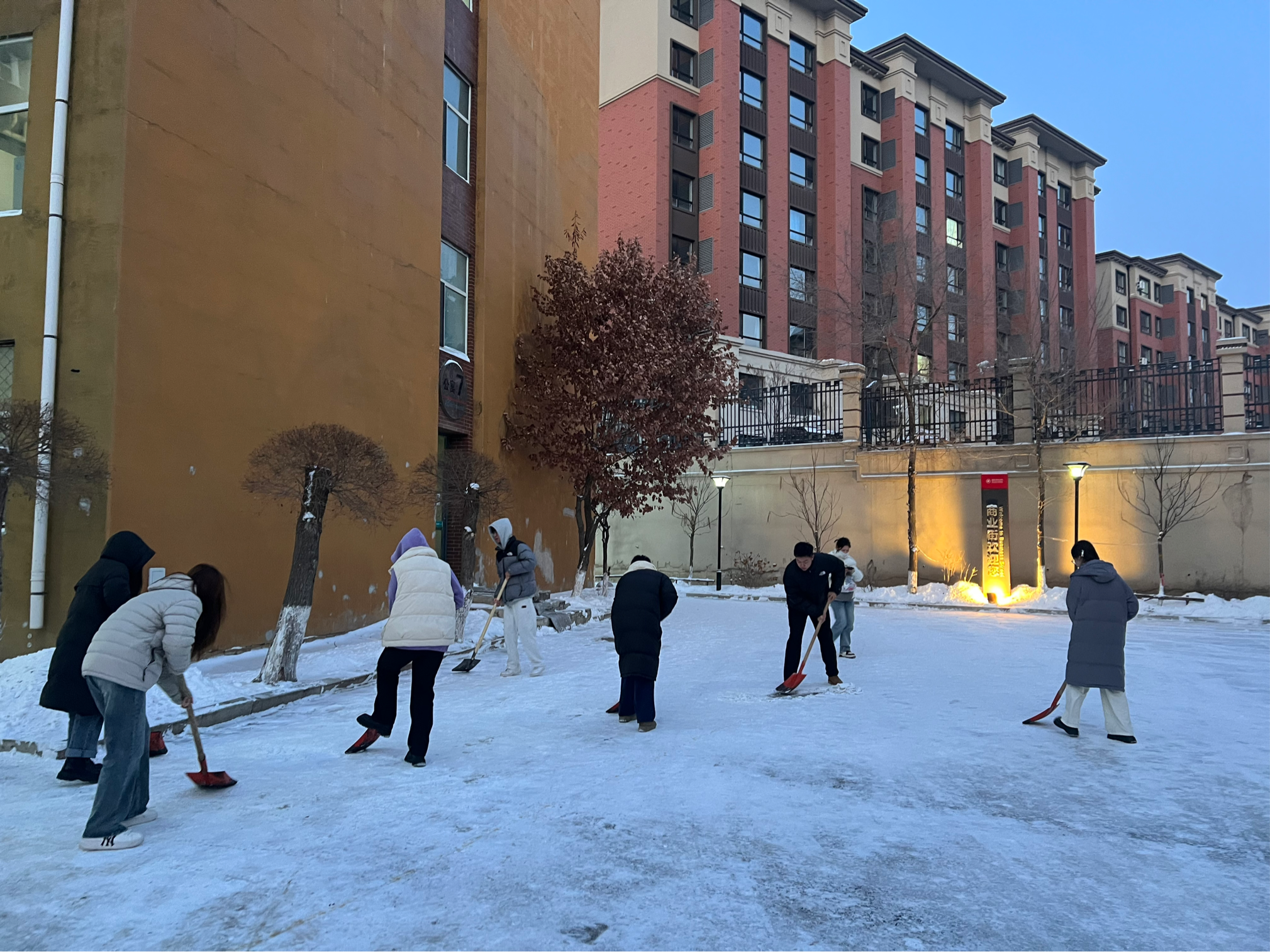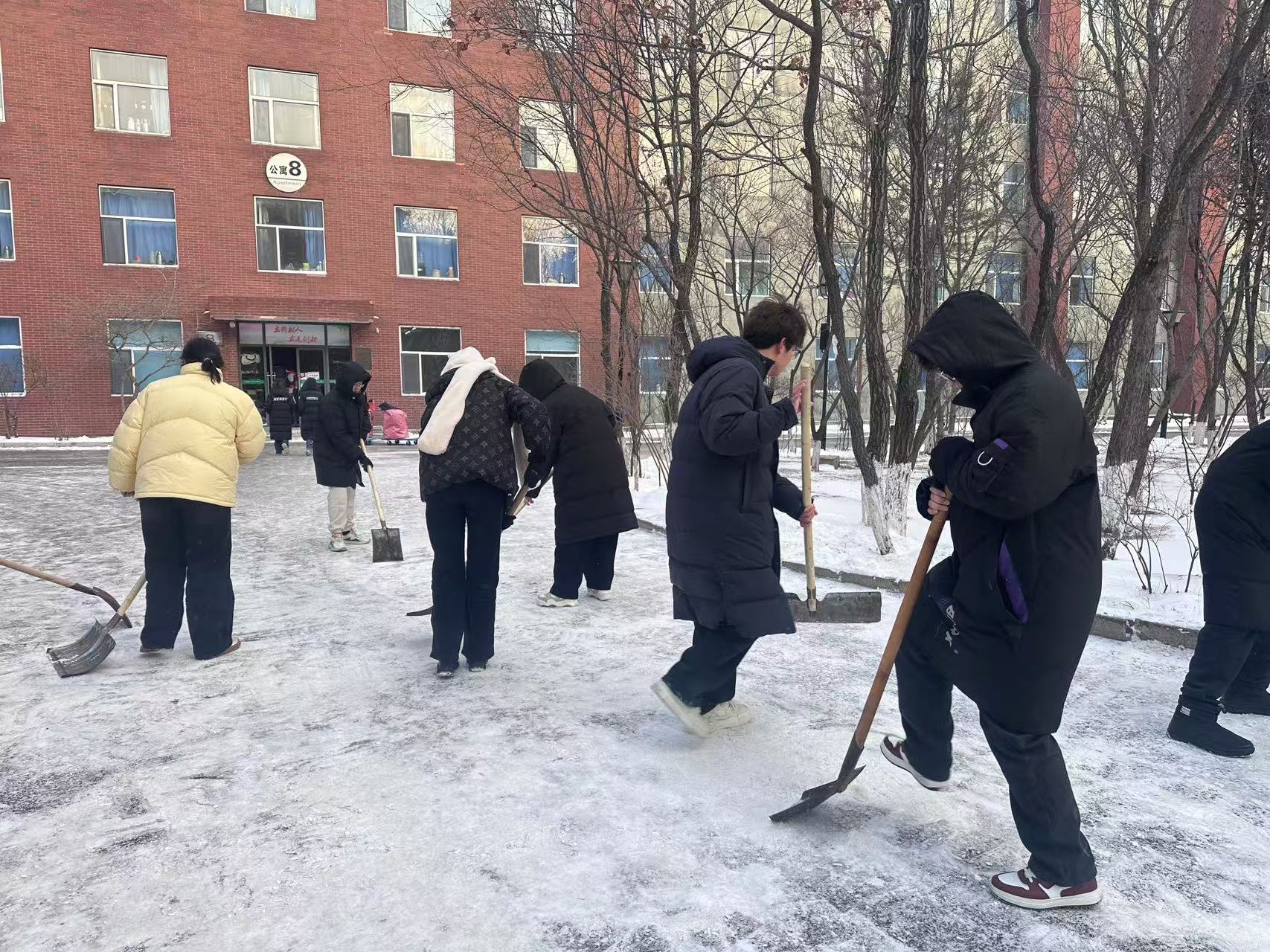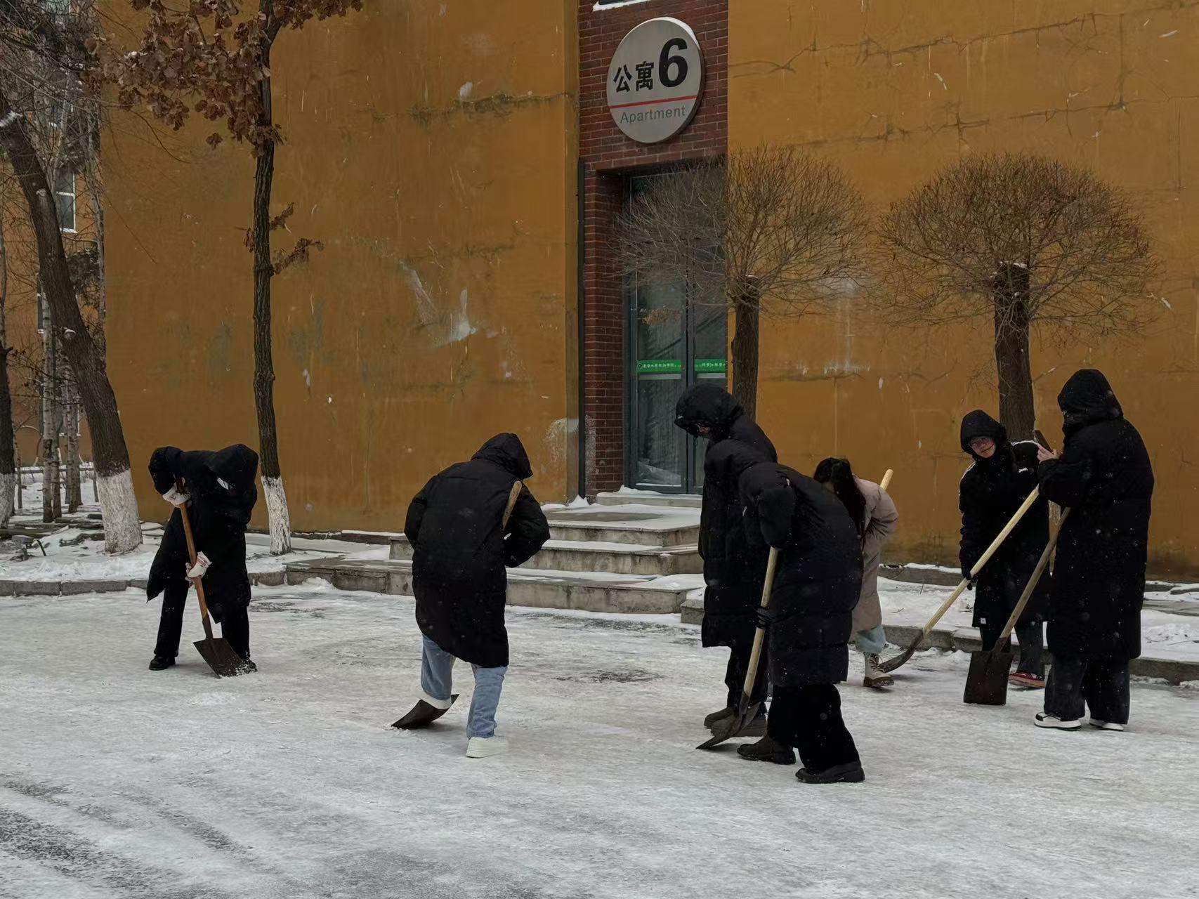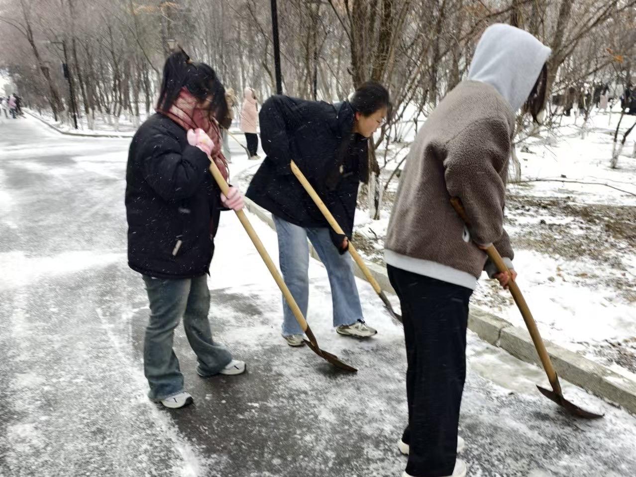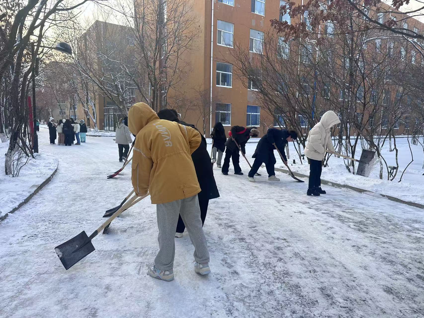 大家不畏严寒,齐心协力,分工明确,有的同学奋力铲除路面上的积雪,有的同学将积雪堆放到一旁,还有的同学负责清扫残留的雪渣。尽管天气寒冷,但同学们热情高涨,脸上虽冻得通红,眼神中却满是坚定与执着。经过数小时的共同努力,学院清雪分担区的主要道路、公寓和教学楼周边的积雪被彻底清理干净,为师生安全出行带来便捷的同时,也传递了一份温暖的力量。