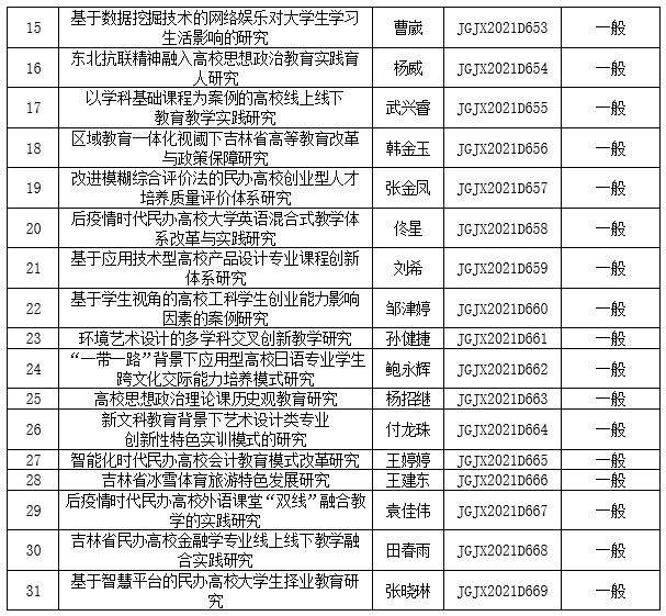近日,吉林省高等教育学会公布2021年度吉林省高教科研课题立项,经金沙官网组织申报推荐、省高教学会专家组评审,最终金沙官网31项课题通过2021年度吉林省高教科研课题立项,其中重点(自筹)课题4项、一般课题27项。请课题负责人按照《吉林省高教科研课题管理办法》进行课题相关研究工作。
