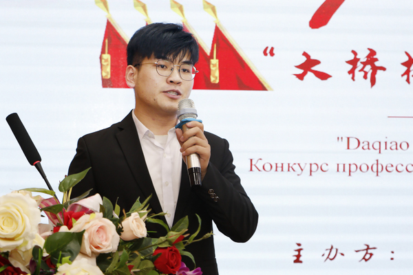 大桥教育集团优秀学员来到现场助演,拉开了大赛序幕。接着来自四校五个专业的选手们展开了激烈角逐。比赛现场,选手们精神昂扬、感情真挚,充分运用PPT、视频等影音资料将文字和图片与音乐和解说紧密结合,向繁荣发展的祖国致敬,向伟大的英雄致敬,向最美抗疫逆行者致敬,他们用各种不同的语言直抒胸臆,传递着中国声音。其中汉语组的戈卢别夫·谢苗·叶甫根尼耶维奇来自俄罗斯科斯特罗马国立大学,他是一位在读博士留学生,虽受到疫情影响不能亲临比赛,但他依然精心录制了比赛视频发到现场,用汉语讲述着他眼中的美丽中国。饱满深情的演绎一次又一次打动了评委和现场观众。最后,大赛评选出一等奖6人、二等奖5人、三等奖6人。