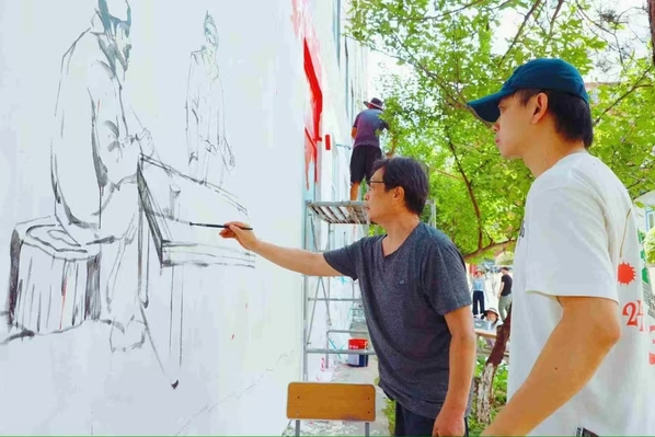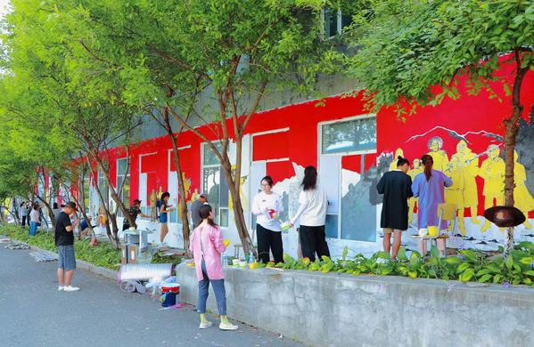 红色主题墙体彩绘主体创意自今年7月启动以来,历时创作近两个月,党委宣传部从全校宣传思想文化大方向,综合考虑宣传效果、扩大教育影响、科学把握选址;艺术学院师生投入大量师资力量,梳理创作思路、确定绘制篇幅、统筹施工步骤、坚持挂图作战;马克思主义学院与专家顾问进行多方沟通、结合思政课程内容、把握史实内容准确;后勤保卫部门积极配合、全力保障、大力支持,学校多部门合作、统筹联动,彩绘主题内容经多次修改、精雕细琢,最终得以完成定稿、落笔动工。